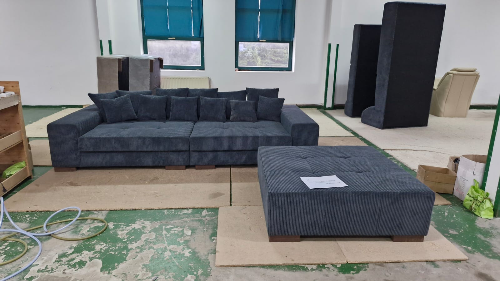| Riesiges Big Sofa mit Hocker und Kissen komplett, auch in Cordstoff Federkern und Komfortschaum, aufwendige Steppnähte, Maße 300cm x140cm +Hocker 120x120cm Preis ab Lager Löhne komplett nur 599,-€ bei Selbstabholung Bezug Cord | |