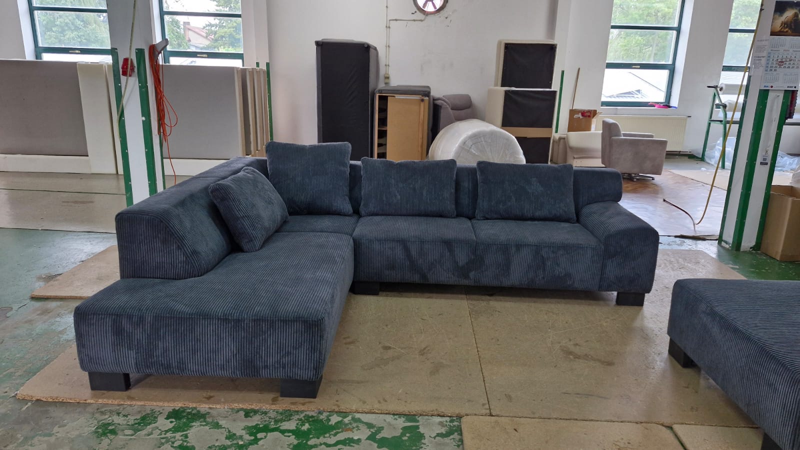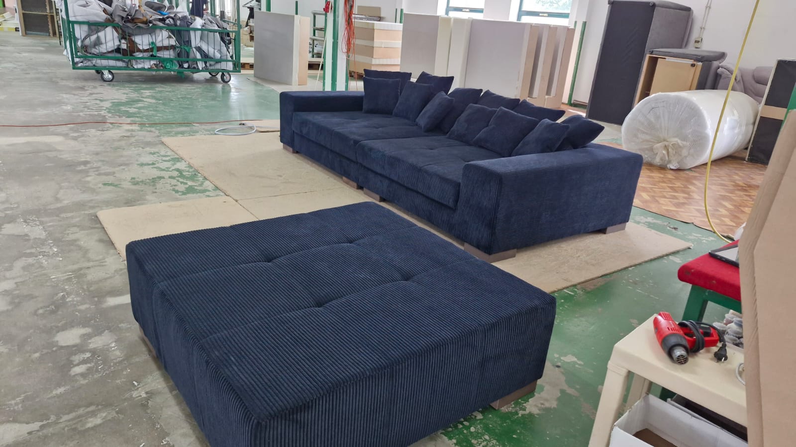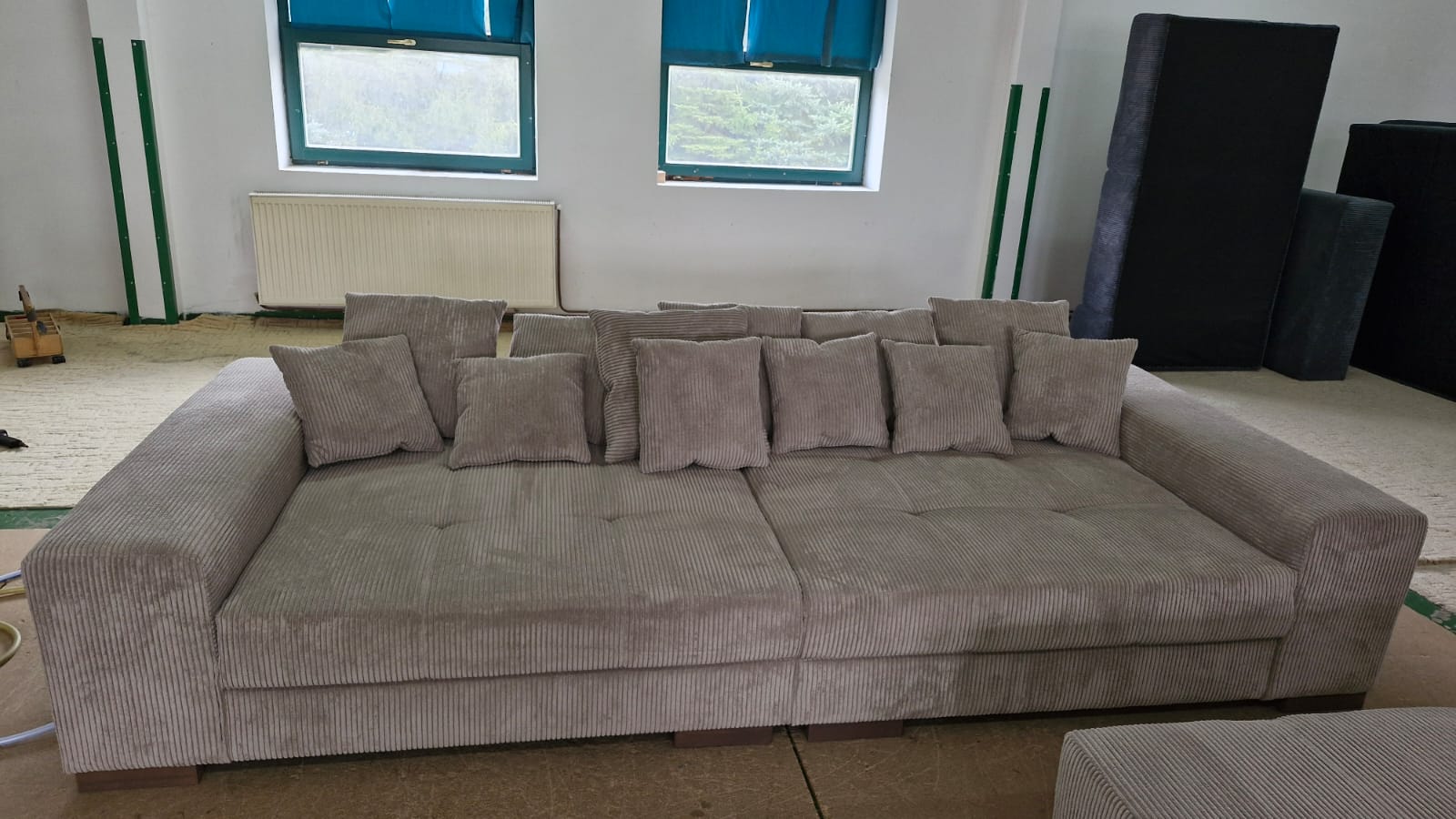 | Riesiges Big Sofa mit Hocker und Kissen komplett, auch in Cordstoff Federkern und Komfortschaum, aufwendige Steppnähte, Maße 300cm x140cm +Hocker 120x120cm Preis ab Lager Löhne komplett nur 599,-€ bei Selbstabholung Bezug Cord | |